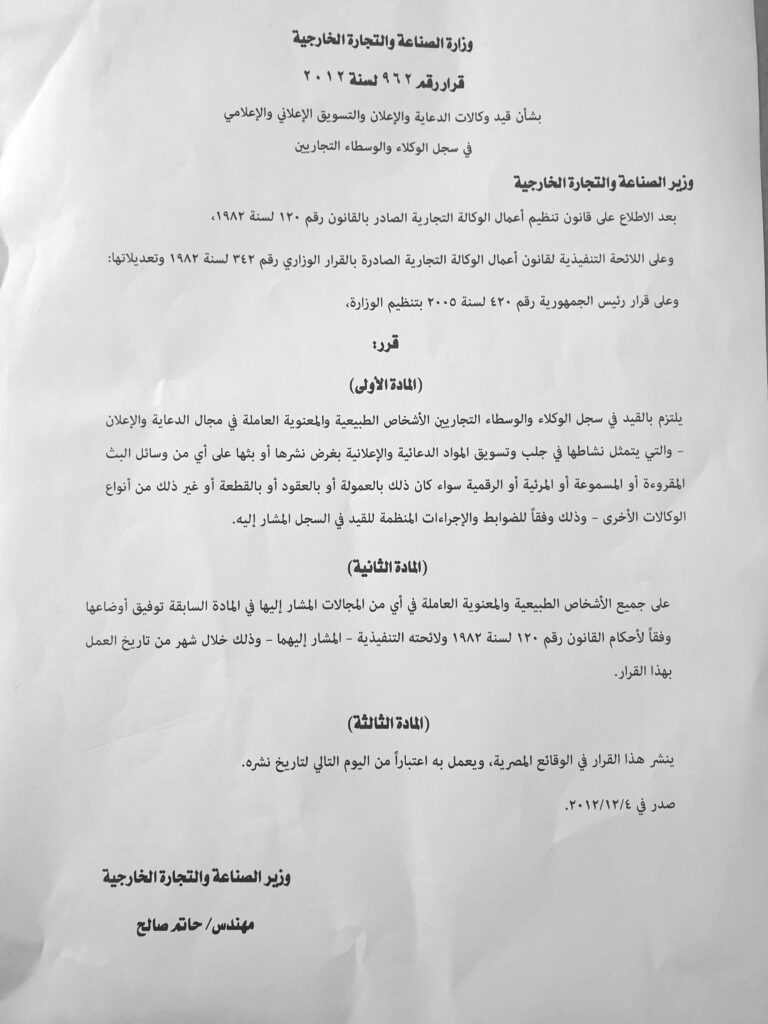 The Decree provides that all agencies and/or natural persons working in the field of marketing and advertising are required to register their company in the Commercial Agents’ Registry, even if it is not the main activity of the company.